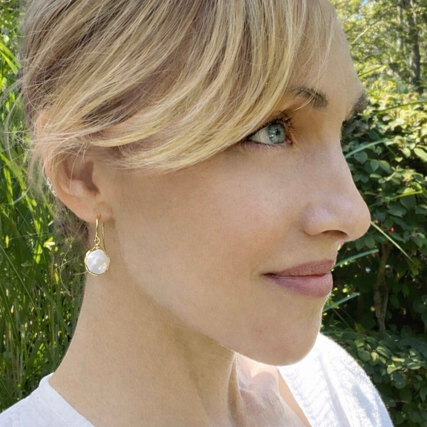 Add a touch of whimsy to your style with these unique handmade bezel-set coin pearl drops. Crafted from genuine fresh water pearls, they’re perfect for sparkling day or night. Playful and elegant, these earrings bring a fresh, natural vibe you’ll adore every time you wear them.