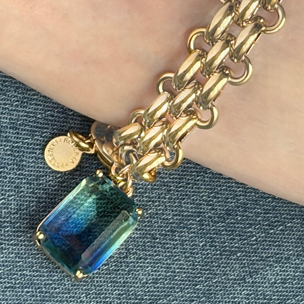 - Elevate your wrist with this stunning faceted ombre bracelet, where mesmerizing blue-green crystals cascade gracefully across a refined triple-row stainless steel design finished in warm gold. Each faceted stone transitions beautifully through the ombre spectrum, creating an eye-catching gradient that catches light from every angle.