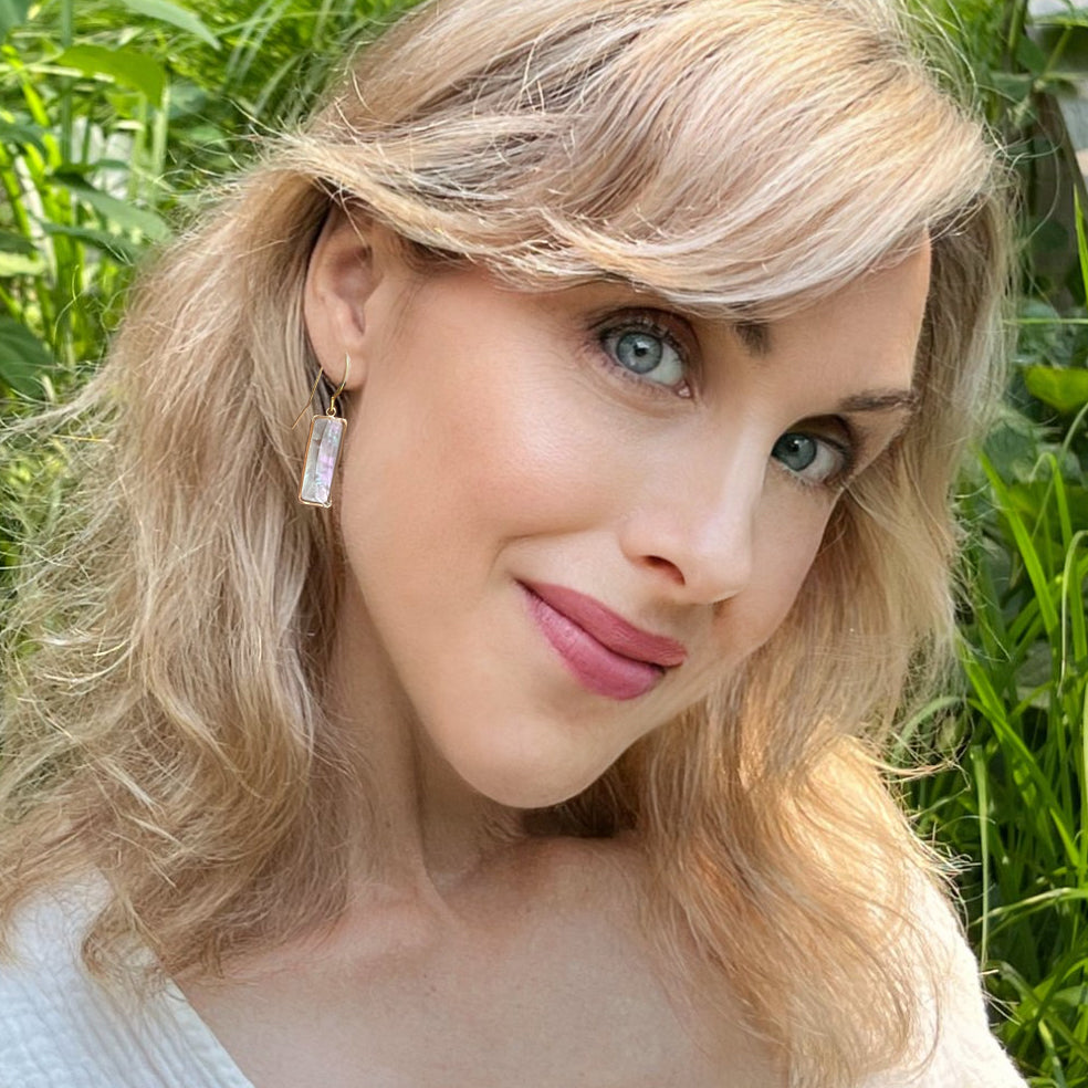 • Catch the light from every angle with these stunning iridescent sliced shell earrings. Each piece features a shimmering shell slice delicately bezel-set in gold, creating an eye-catching play of color that shifts beautifully throughout the day. Effortlessly elegant enough for evening events yet casual enough for everyday wear, these earrings are your go-to accessory for adding a touch of natural glamour to any look.