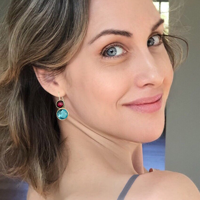 - Add a splash of color to your day with these playful earrings featuring stunning indicolite and ruby crystal drops, bezel set in gleaming gold. Their vibrant blue and red hues make them perfect for adding a fun and elegant touch to any daytime look. Lightweight and eye-catching, these earrings are designed to brighten your mood and your outfit all day long.